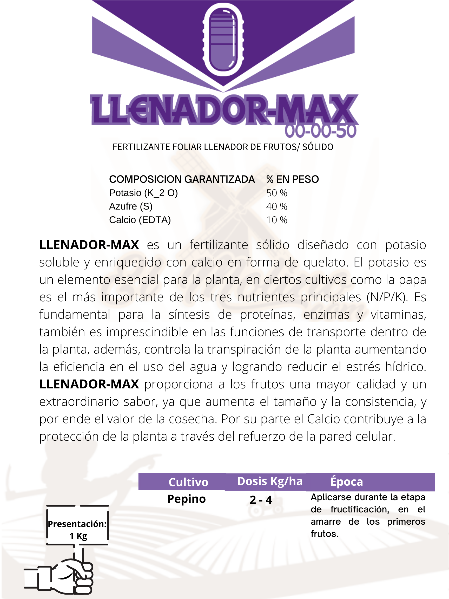 LLENADOR-MAX es un fertilizante sólido diseñado con potasio soluble y enriquecido con calcio en forma de quelato. El potasio es un elemento esencial para la planta, es fundamental para la síntesis de proteínas, enzimas y vitaminas, también es imprescindible en las funciones de transporte dentro de la planta, además, controla la transpiración de la planta aumentando la eficiencia en el uso del agua y logrando reducir el estrés hídrico. LLENADOR-MAX proporciona a los frutos una mayor calidad y un extraordinario sabor, ya que aumenta el tamaño y la consistencia, y por ende el valor de la cosecha. Por su parte el Calcio contribuye a la protección de la planta a través del refuerzo de la pared celular.